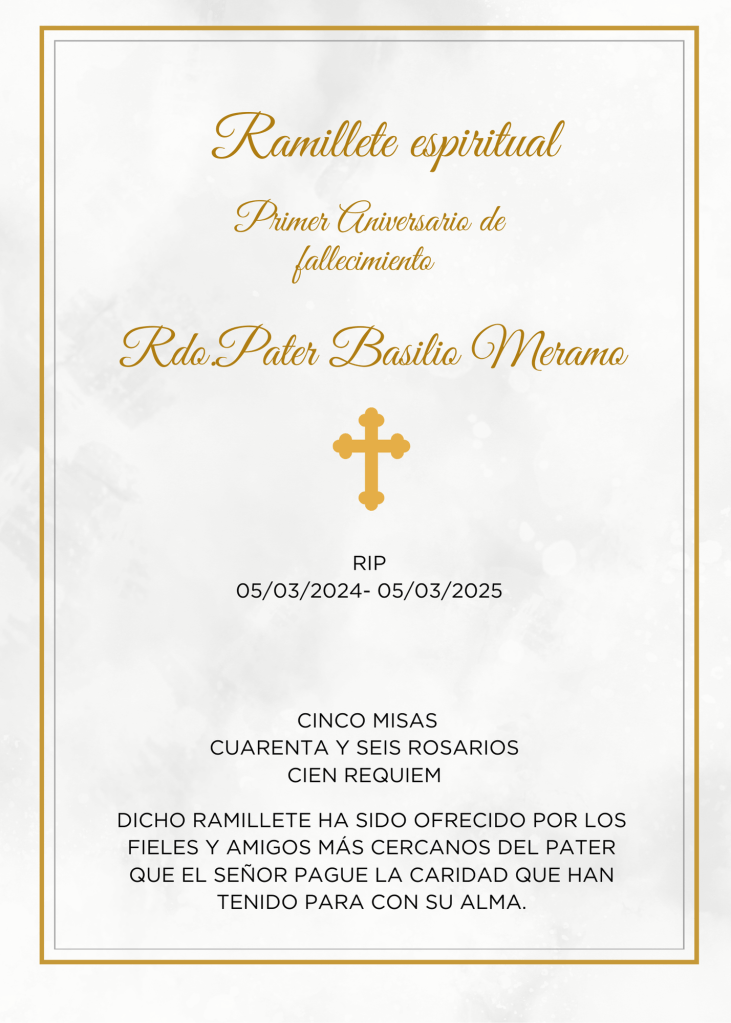 Tras cumplirse el primer año de la desaparición física del Rvdo. Pater Basilio Meramo , queremos recordarlo como aquel gran sacerdote, aguerrido, de fuertes palabras pero de trato cariñoso, estudiado y generoso, con corazón grande como suelen tener aquellos que buscan el Reino de Dios, colaborador y amigo de los que hacemos Radio Cristiandad, sostén en momentos tristes y generoso dador de animo y fuerza para seguir en la batalla.