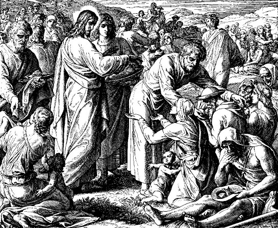 En aquel tiempo: pasó Jesús a la otra parte del mar de Galilea, que es de Tiberíades. Y le seguía una grande multitud de gente, porque veían los milagros que hacía sobre los enfermos. Subió, pues, Jesús, a un monte, y se sentó allí con sus discípulos. Y estaba cerca la Pascua, día de gran fiesta para los judíos. Y habiendo alzado Jesús los ojos, y viendo que venía a Él una gran multitud, dijo a Felipe: ¿Dónde compraremos pan para que coma esta gente? Esto decía por probarle; porque Él sabía lo que había de hacer. Felipe respondió: Doscientos denarios de pan no alcanzan para que cada uno tome un bocado. Uno de sus discípulos, Andrés, hermano de Simón Pedro, le dijo: Aquí hay un muchacho que tiene cinco panes de cebada y dos peces: mas ¿qué es esto para tanta gente? Pero Jesús dijo: Haced sentar a esas gentes. En aquel lugar había mucha hierba. Y se sentaron a comer, como en número de cinco mil hombres. Tomó Jesús los panes, y habiendo dado gracias, los repartió entre los que estaban sentados; y asimismo de los peces, cuanto querían. Y cuando se hubieron saciado, dijo a sus discípulos: Recoged los trozos que han sobrado, para que no se pierdan. Y así recogieron y llenaron doce canastos de trozos de los cinco panes de cebada, que sobraron a los que habían comido. Aquellos hombres, cuando vieron el milagro que había hecho Jesús, decían: Este es verdaderamente el profeta que ha de venir al mundo. Y Jesús, notando que habían de venir para arrebatarle y hacerle rey, huyó otra vez al monte Él sólo.