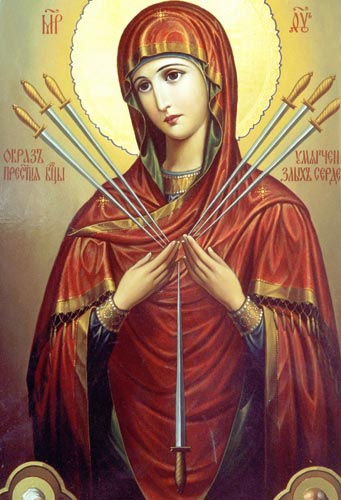 Por la espada de dolor que traspasó vuestra alma, cuando Simeón os anunció la pasión y muerte de vuestro Hijo; concededme, Madre afligida un profundo dolor de mis pecados: y para conseguirlo os saludo con un Padre nuestro y siete Ave Marías.