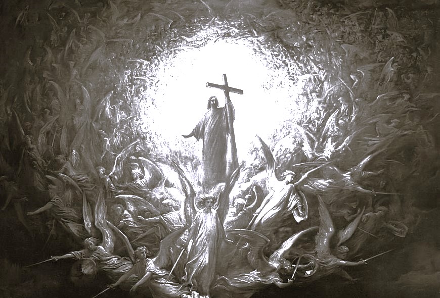 Y he ahí que hubo un gran terremoto, porque un ángel del Señor bajó del cielo, y llegándose rodó la piedra, y se sentó encima de ella. Su rostro brillaba como el relámpago, y su vestido era blanco como la nieve. Y de miedo a él, temblaron los Guardias y quedaron como muertos. Habló el ángel y dijo a las mujeres: “No temáis, vosotras; porque sé que buscáis a Jesús, el crucificado. No está aquí; porque resucitó, como lo había dicho. Venid y ved el lugar donde estaba. Luego, id pronto y decid a sus discípulos que resucitó de los muertos, y he aquí que os precederá en Galilea; allí lo veréis. Ya os lo he dicho.” Ellas, yéndose a prisa del sepulcro, con miedo y gran gozo, corrieron a llevar la nueva a los discípulos de Él. Y de repente Jesús les salió al encuentro y les dijo: “¡Salud!” Y ellas, acercándose, se asieron de sus pies y lo adoraron.