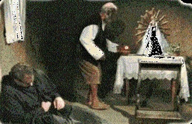 Poco antes de llegar a la vivienda de doña Matos, era tan mal el estado en el que se encontraba que lo dieron por muerto. Lo llevaron como pudieron y el Negro Manuel le ungió en el pecho con el aceite de la lámpara, y de esa manera volvió en sí. Luego le dijo que creyese que se iba a sanar perfectamente de su enfermedad, porque su Ama (así llamaba a la Virgen) lo quería como su primer Capellán, y que así había de suceder.