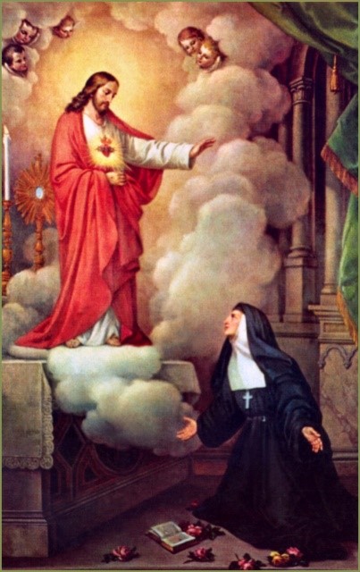 Estando Margarita María delante del Santísimo Sacramento recibió la siguiente revelación: “Hallándome, dice, toda inundada de la divina presencia, hasta el punto de olvidarme de mi misma y del lugar en que me encontraba, me abandone enteramente a este divino espíritu y a la fuerza de su amor. Nuestro Señor me hizo descansar largo tiempo sobre su sagrado pecho, en el cual me descubrió las maravillas de su amor y los inexplicables secretos de su Corazón… Mi divino Corazón, me dijo, esta tan apasionado de amor por los hombres, y por ti particularmente, que no pudiendo contener en mí mismo las llamas de mi ardiente caridad, es preciso que por tu medio las derrame y se manifiesten al mundo para enriquecer a los hombres con los preciosos tesoros que te descubro, y que contienen las gracias saludables de santificación y las necesarias para apartarlos del camino de perdición. Yo te he escogido, no obstante de ser un abismo de indignidad y de ignorancia, para el cumplimiento de este gran designio, a fin de que todos comprendan que es obra mía.