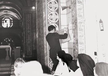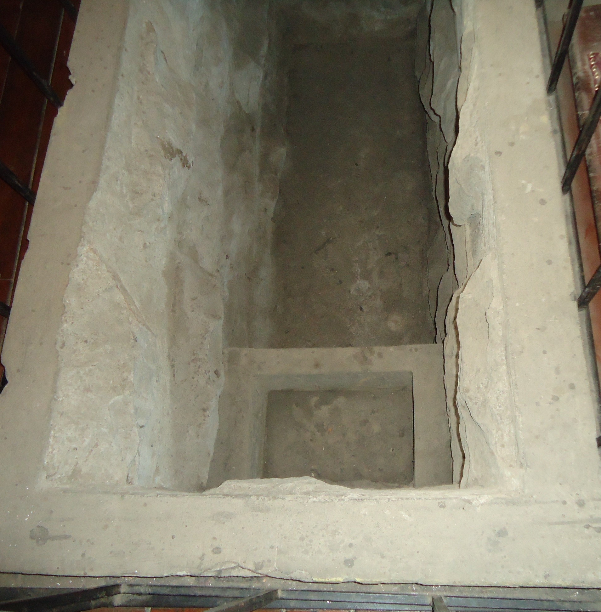 A la Hermana Mercedes le llamó la atención uno de los huecos que había quedado en el lado occidental del altar. Sobre una especie de lápida halló tres iniciales: GGM.