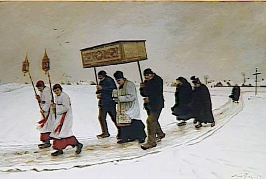 Delante del sacerdote hay dos jóvenes con hábitos de altar que portan faroles encendidos. Uno de ellos, con cierta impaciencia, nos mira, como diciendo: «¿Por qué nos miran como si esto fuera algo inusual? ¿No se dan cuenta de que simplemente estamos cumpliendo con nuestro deber hacia Dios y el prójimo?». Dos mujeres con gruesos abrigos de invierno, una de ellas con un tocado típico de la región, cierran la pequeña procesión. Llevan la cabeza inclinada y se percibe su silenciosa reverencia mientras caminan juntas al paso, quizás rezando en silencio el Padrenuestro y el Avemaría .