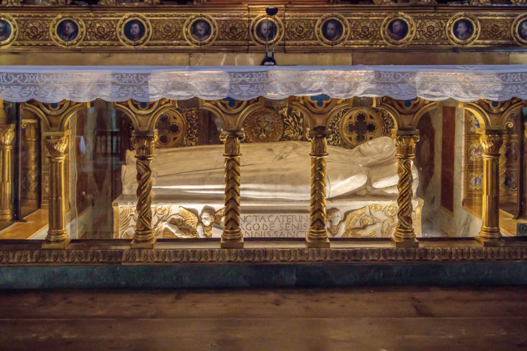 La Basílica de Santo Domingo es una imponente iglesia de la Orden Dominica que data del siglo XIIIth siglo. (Santa Catalina fue terciaria dominica.) La basílica alberga sus reliquias – especialmente su cabeza incorrupta y su pulgar derecho, así como obras de arte que representan su vida.