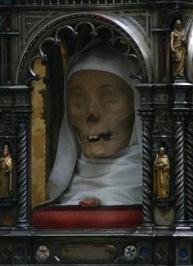 Santa Catalina murió en Roma en 1380, a los 33 años. Cuando su cuerpo fue – tras informes de numerosos milagros – trasladado del cementerio a la Basílica de Santa Maria sopra Minerva, el beato Raimundo de Capua, director espiritual de Santa Catalina y Maestre General de la Orden Dominicana, con permiso del papa Urbano VI, separó la cabeza del cuerpo para que pudiera ser enviada a Siena, para ser expuesto públicamente tras su canonización.
