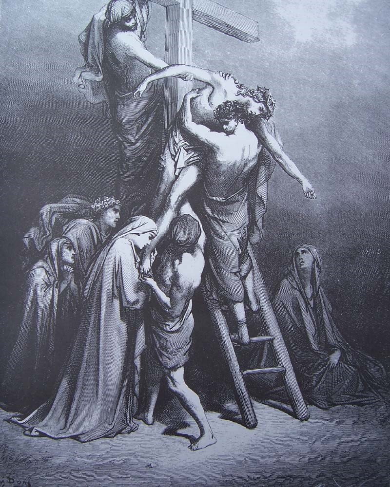 Y desearon se le retirase de la cruz, porque vieron que la gente se compungía de verle y le confesaba por justo y por Hijo de Dios queriendo quitársele de los ojos para oscurecer su gloria.