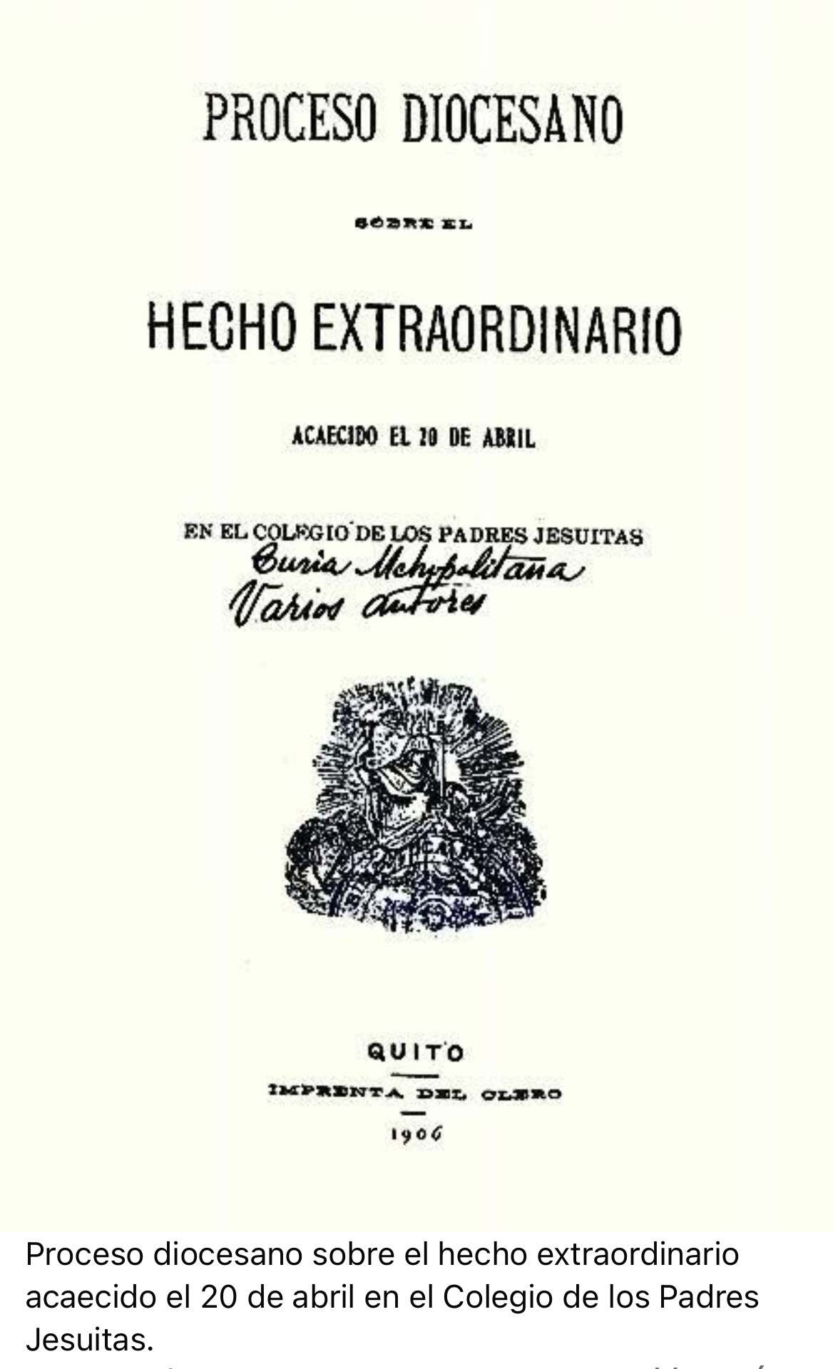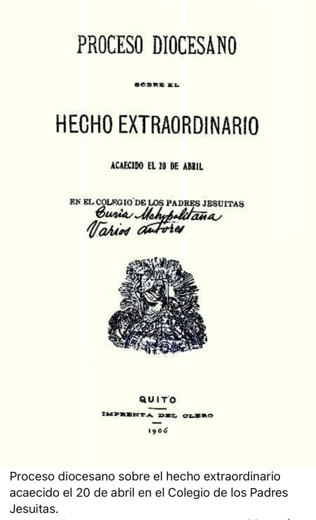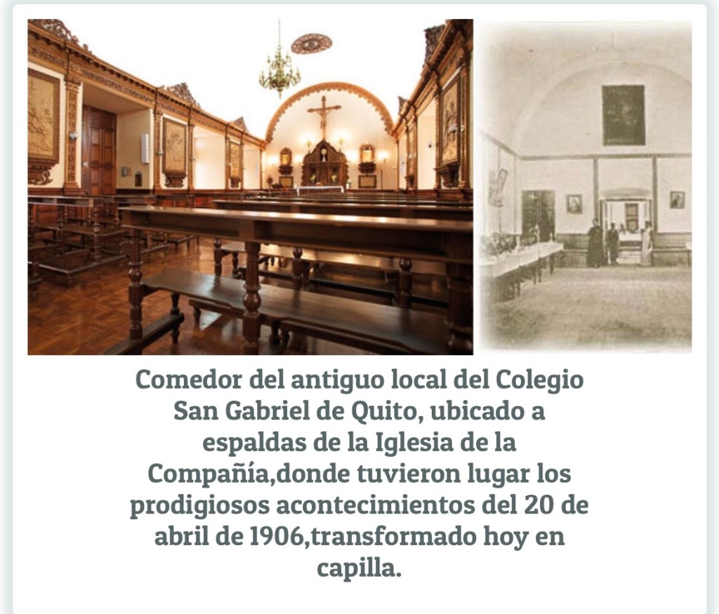 Fue precisamente en sus muros donde la Providencia obró el prodigio que renovaría la esperanza. La noche del viernes 20 de abril de 1906, alrededor de las 20:00 horas, treinta y cinco alumnos internos del Colegio San Gabriel entre ellos Jaime Chávez Ramírez, Carlos Herman y Pedro Donoso, de edades comprendidas mayormente entre los 10 y 17 años, regresaban de una excursión al Pichincha y cenaban en el refectorio del antiguo edificio, situado en las calles Benalcázar y Sucre, en pleno centro histórico de Quito.
